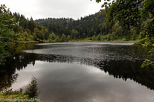 Auf halber Strecke um den See nutzen wir eine der Bänke für eine erste kurze Pause. Da es noch früh am Vormittag ist, haben wir den beliebten Rastplatz für uns alleine. Hier zu Verweilen und die Blicke über das dunkle Wasser des Weihers schweifen zu lassen, ist einfach herrlich. Neben dem Feuerkraut erfreuen wir uns an den ebenfalls leuchtenden Früchten der Vogelbeere und dem am Waldrand blühenden Roten Fingerhut.