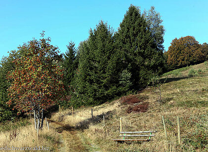 Gut gestärkt, spazieren wir anschließend um die Torfinsel herum. Kurz bevor wir den See ganz umrundet haben, biegen wir scharf rechts ab und folgen der blauen Raute Richtung Weiherfelsen. Allerdings passieren wir den Aussichtspunkt nur auf etwa halber Höhe und biegen bei »Althütte«, dem höchsten Punkt der Wanderung, rechts zur Fischerhütte ab.